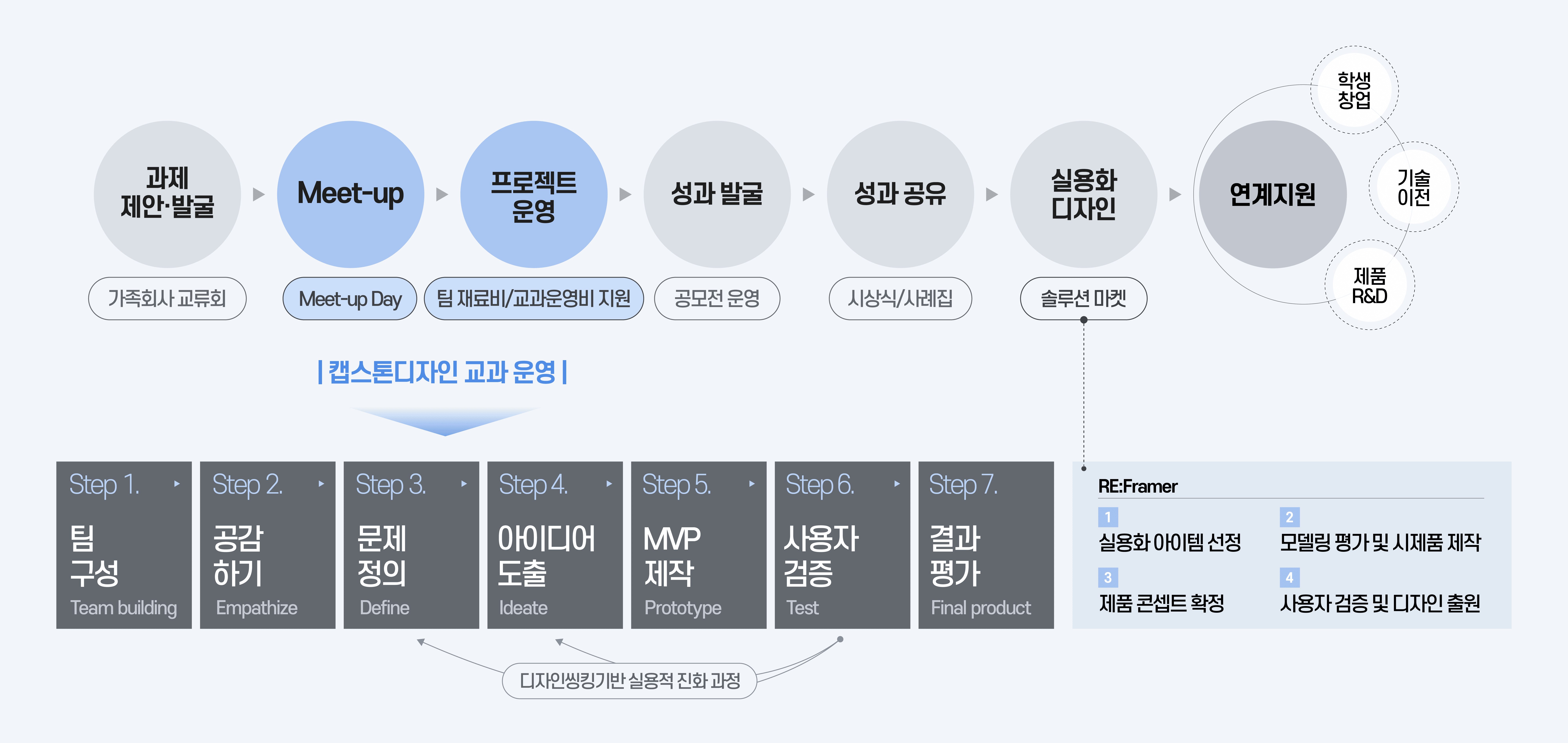 충남대학교 RISE사업단에서는 캡스톤디자인 지원을 수요발굴→과정 설계→교과 운영→성과 확산 단계로 체계화 하고 ‘실용화 성과와 글로벌 연계 확대’로 성과 모델을 구체화하였습니다.