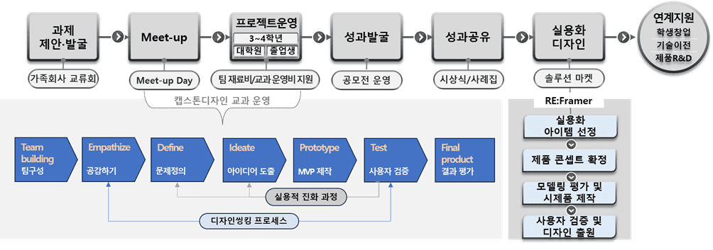 충남대학교 RISE사업단에서는 캡스톤디자인 지원을 수요발굴→과정 설계→교과 운영→성과 확산 단계로 체계화 하고 ‘실용화 성과와 글로벌 연계 확대’로 성과 모델을 구체화하였습니다.
