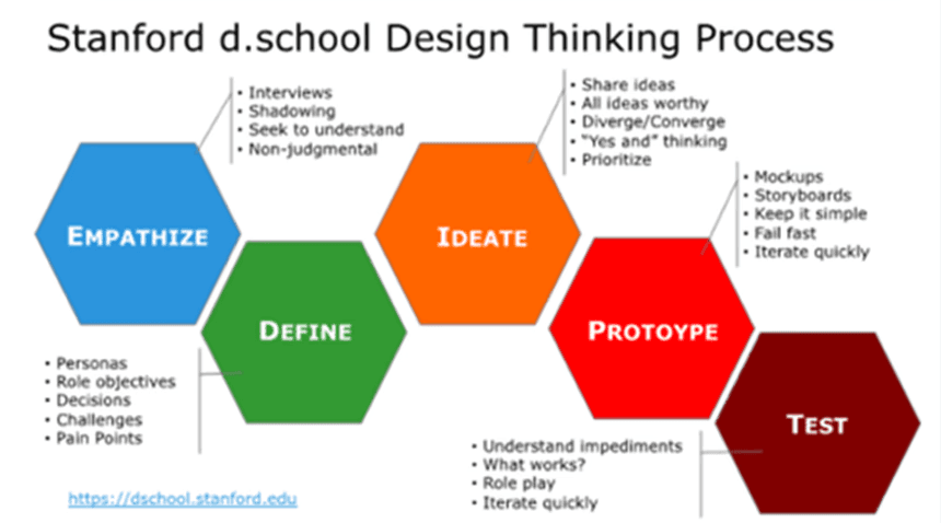 IDEO는 미국 스탠퍼드 대학교의 하소 플래트너 디자인 연구소(Hasso Plattner Institute of Design, 이하 ‘D스쿨’)와 함께 2000년대부터 2010년대에 디자인 씽킹 방법론을 널리 전파했습니다.