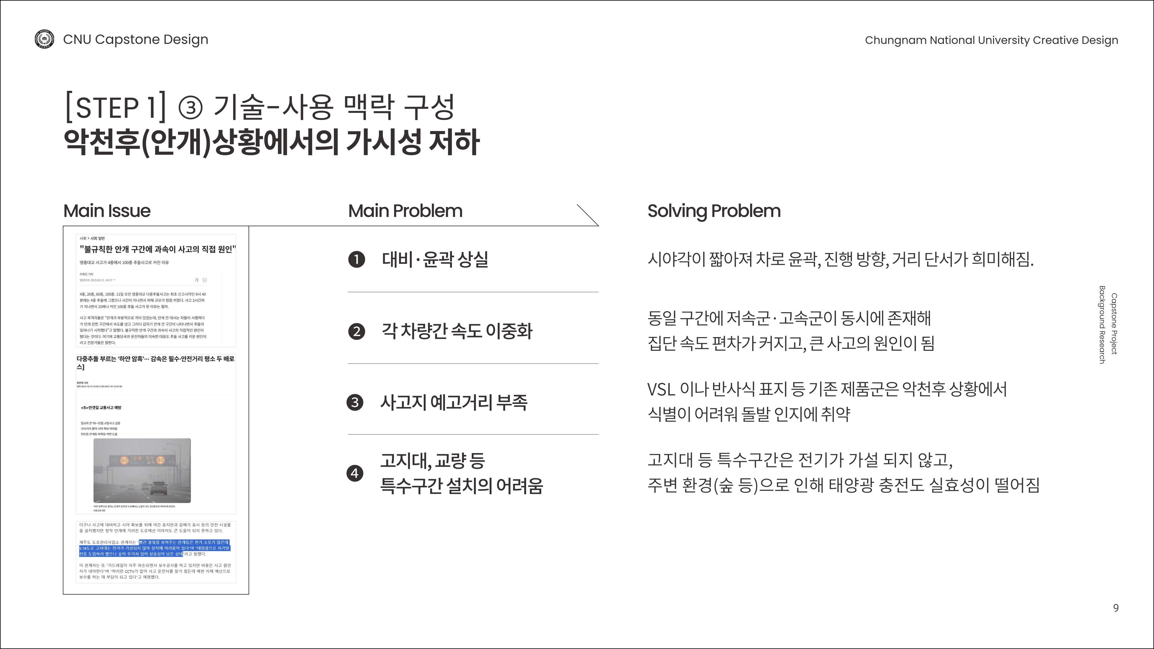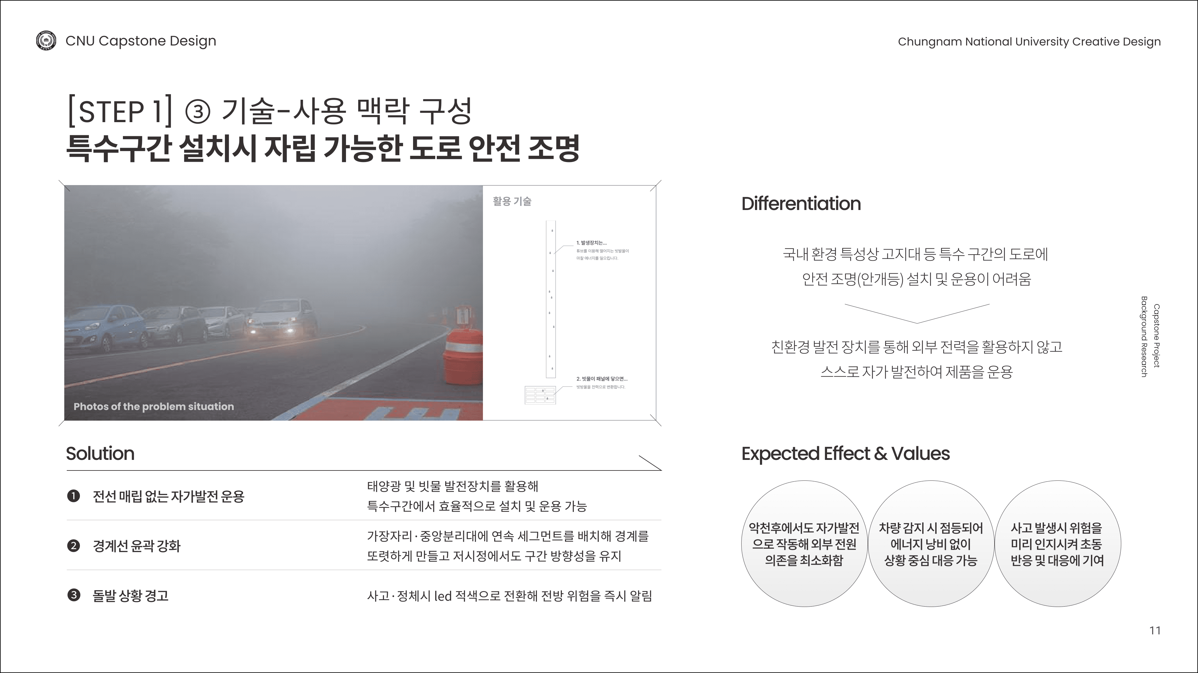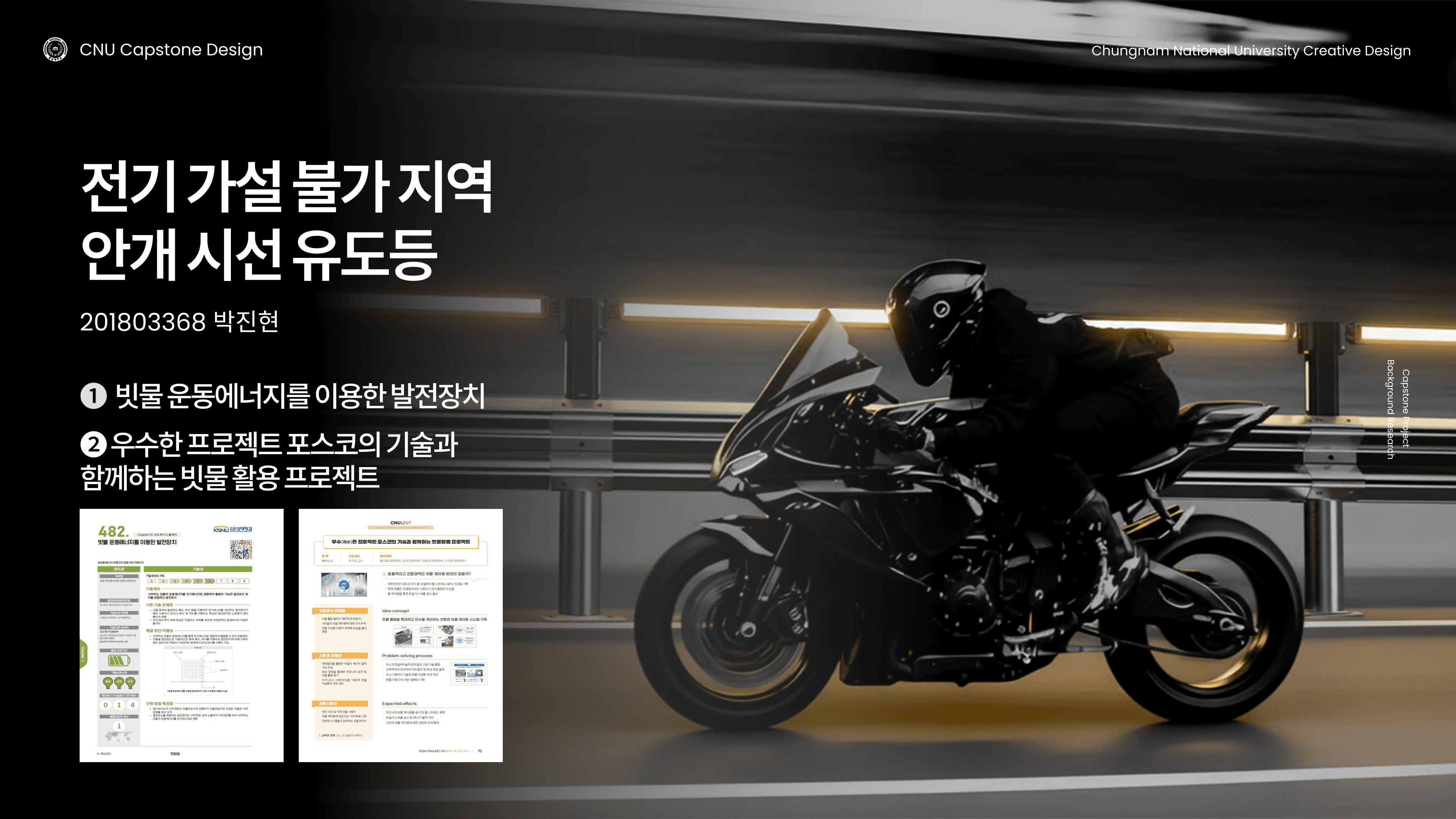 전기 인입이 어려운 도로·산책로 등에서 안개·비로 가시성이 급감해 안전사고 위험이 커지는 문제를 해결하기 위한 과제입니다. 빗물 운동에너지와 태양광을 활용한 자가발전형 시선 유도등을 제안해, 악천후에도 경계선·윤곽을 선명하게 보여 주고 설치·운영 부담을 줄이며 상용화 가능성까지 검토합니다.